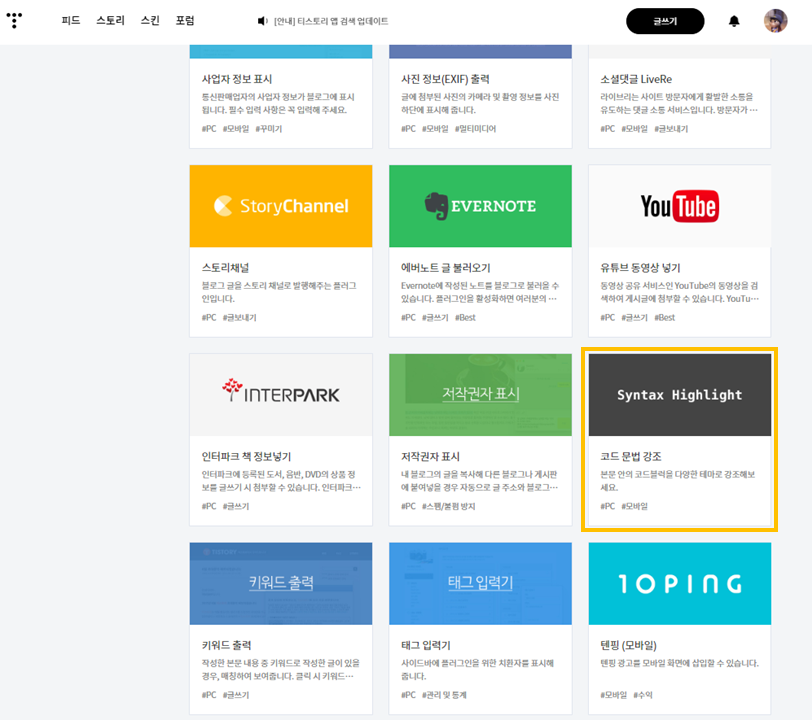 블로그 관리 > 플러그인 에 들어가서 Syntax Highlight 를 선택합니다.