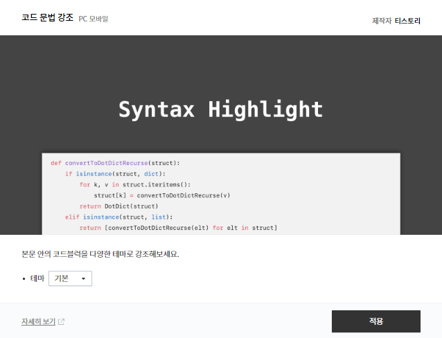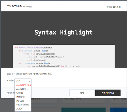 제공되어 있는 테마 이외에 테마를 원하신다면 GitHub에 공개된 highlight.js를 포함하여 이미 공개된 코드 하이라이터를 적용하시거나 필요한 형태로 만들어 사용하실수도 있습니다.