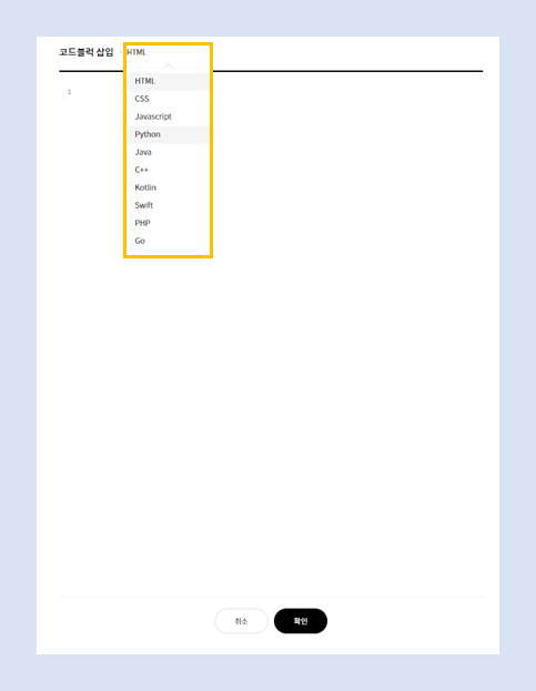 코드블럭을 선택하면 코드블럭 삽입 창이 뜨고 입력 언어를 선택할 수 있습니다. 코드를 입력하고 확인을 눌러주세요.