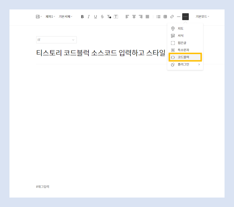 티스토리 새로운 에디터를 열고 더보기를 눌러주면 코드블럭이 보입니다. 코드블럭을 선택해주세요.