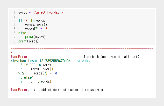 5번 행인 words[7] = '&' 문장에서 오류가 난 것을 확인 할 수 있습니다. 공백을 '&'로 바꿔쓰기 위해서 사용한 듯 한데 오류가 발생했습니다. 오류를 읽어보면 문자열의 요솟값은 바꿀 수 있는 값이 아니기 때문에 발생한 것을 알 수 있습니다. 문자열 자료형은 그 요솟값을 변경할 수 없는 immutable(불변의) 자료형이라 불립니다.