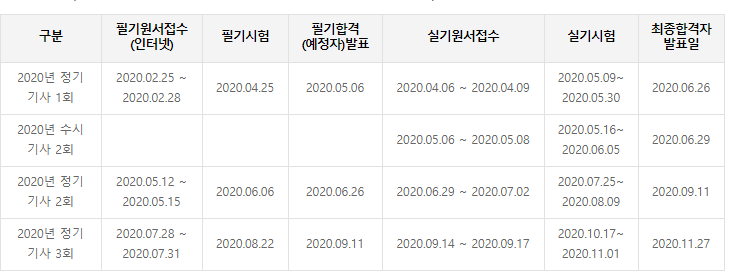 아래는 큐넷 (Q-net)에서 제공하는 2020 월간 시험일정입니다.