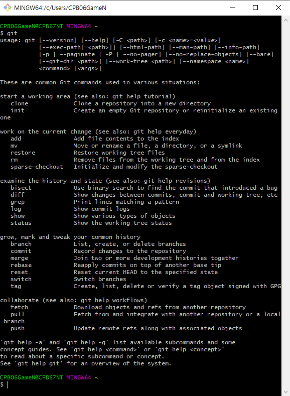 gitbash에서 git을 입력하고 엔터를 쳤을때 다음과 같은 화면이 뜨면 설치가 잘 된 것입니다.