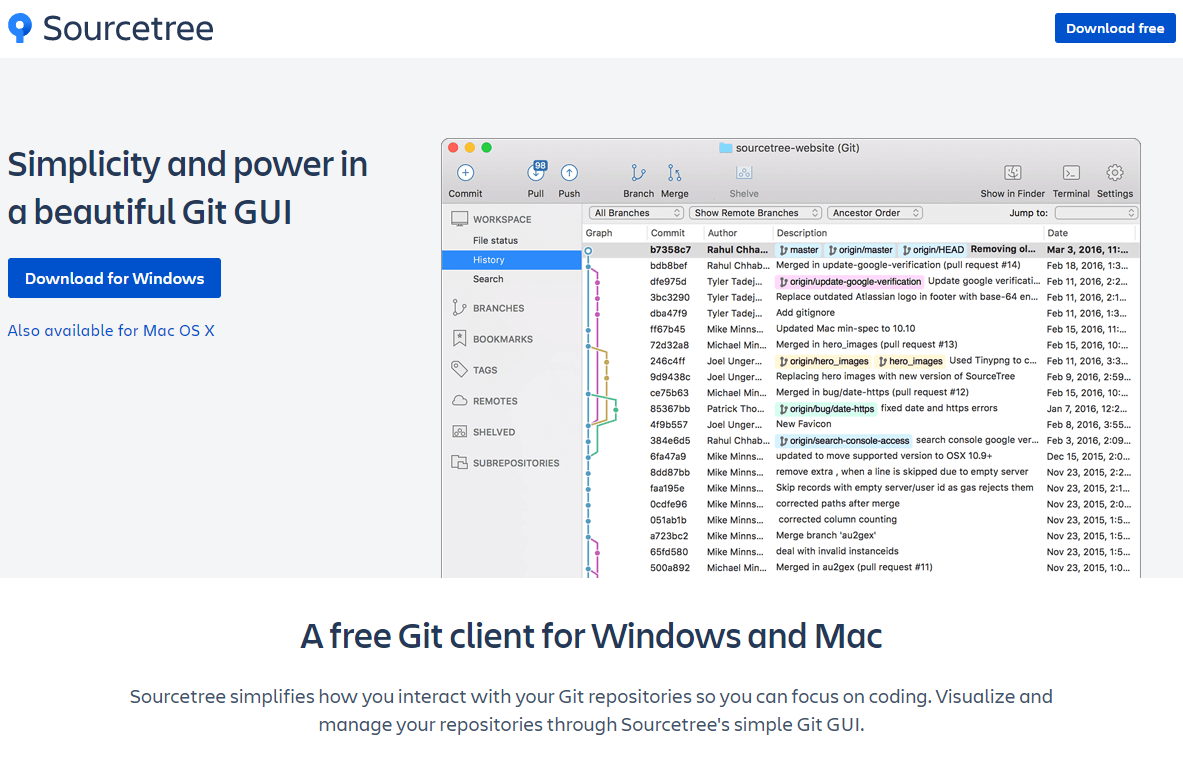 A Git GUI that offers a visual representation of your repositories. Sourcetree is a free Git client for Windows and Mac.