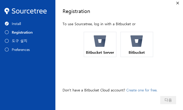 설치파일을 열면 아래와 같은 화면이 생길 겁니다. 저는 bitbucket을 클릭해서 로그인 해주었어요.