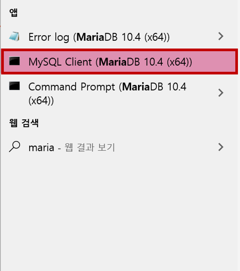 시작메뉴에 mariadb를 검색하여 MySQL Client 를 클릭합니다.