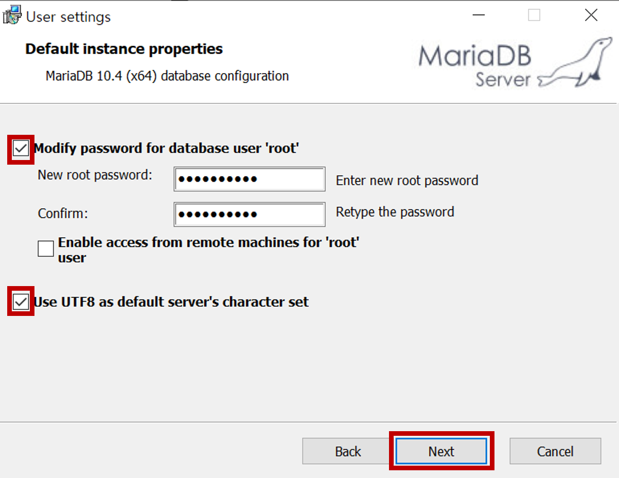 root 계정의 비밀번호를 입력하고 원격으로 루트계정을 접근할수 있는지 체크박스, UFT8 문자인코딩 지원 여부 체크박스를 선택해줍니다.