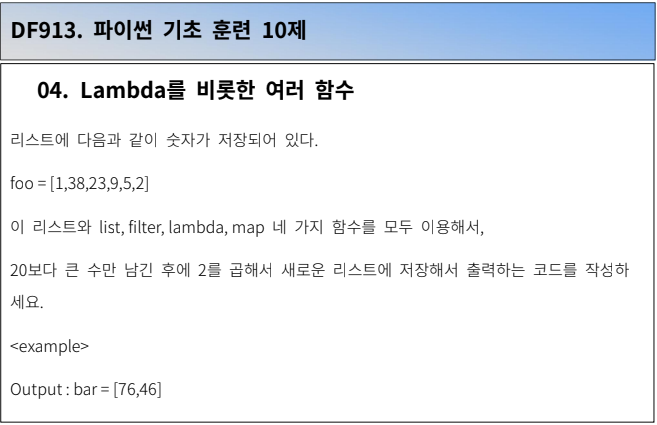 이번 문제는 파이썬의 내장함수 filter, lambda, map의 쓰임만 알고 있다면 쉽게 해결 할 수 있었습니다.