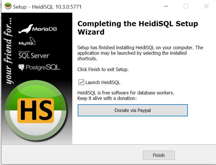 7) 설치가 완료되었습니다. finish 버튼을 눌러 HeidiSQL 설치를 끝냅니다.