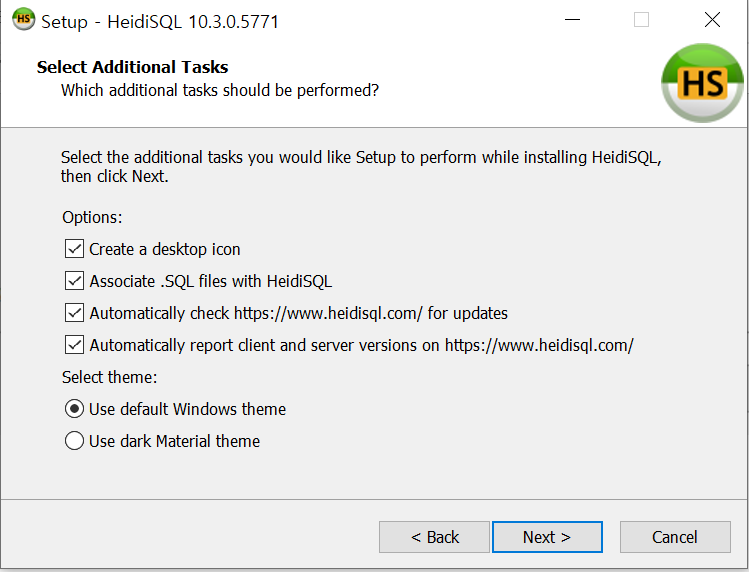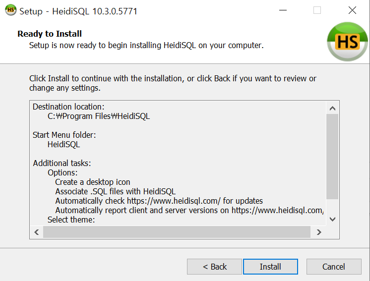 옵션은 네 가지로 배경화면 아이콘을 생성할지, sql 확장자를 HeidiSQL 프로그램으로 실행할지,