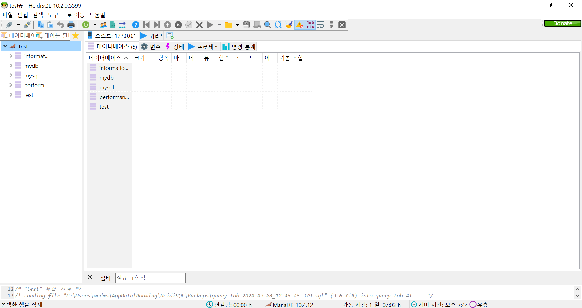 이제 접속이 되었으니 HeidiSQL을 본인의 목적에 맞게 사용하시면 될 것 같습니다.