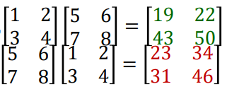 행렬의 곱은 순서가 중요하기 때문에 교환법칙은 성립하지 않습니다.