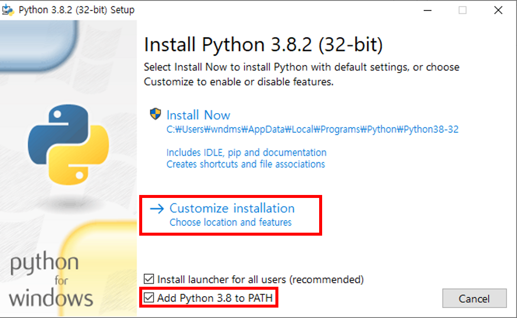 Add Python 3.8 to PATH 를 체크해주면 별도의 환경변수 설정 없이 진행할 수 있습니다.