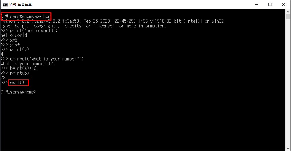 윈도우 명령프롬프트(cmd)창에서 python을 입력하고 enter키를 눌러줍니다.