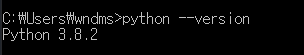 마찬가지로 cmd창에서 python —version이라고 입력하고 엔터를 눌러줍니다. Python 3.8.2 버전이 설치되어있다는 것을 확인할수 있네요.