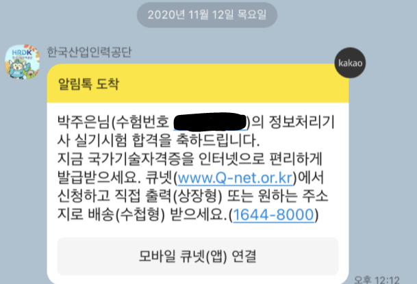 12시 12분 ㅋㅋㅋ큐넷에서 두개의 알림톡이 왔다