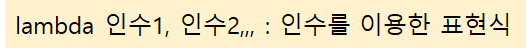 lambda def와 같이 함수를 생성할 때 사용되는 예약어로 def보다 짧게 작성이 가능합니다. def 를 쓸 수 없는 구조거나 복잡하지 않은 구조에 lambda를 사용하여 함수를 정의합니다. >>> mul = lambda a,b: a*b >>> mul(2,3) 6 >>> def mul(a,b): return a*b >>> mul(2,3) 6 def 가 아닌 lambda함수를 사용하는 이유는 일시적인 함수로 필요한 곳에서 사용하고 바로 버릴 수 있습니다. 함수의 이름이 따로 정해줄 필요가 없으며 익명 함수 입니다. return 문이 필요하지 않고 반환값을 만드는 표현식을 통해 정의합니다. def 안에서 lambda 함수를 함께 사용하면서 여러개의 증분 함수를 만들어 독립적으로 사용할 수 도 있습니다. ..